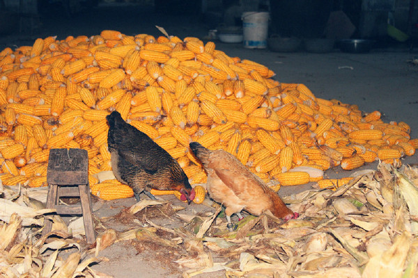小鸡们则可以吃到躲在外衣中的玉米虫和散落的玉米粒。