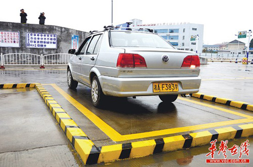 12月10日上午,长沙市驾考新规试水,一名学员正在进行倒桩入库的考试。拆除了标杆以后,考试难度明显增加。 |