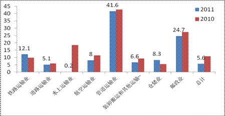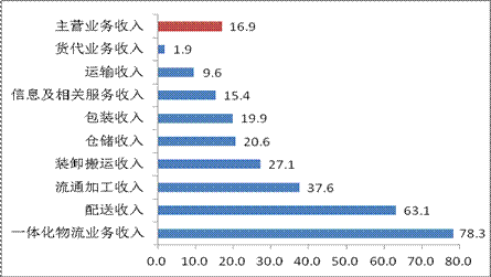 2011年物流企业主营业务收入比上年增长16.9%。其中,运输收入增长9.6%;仓储收入增长20.6%;配送收入和一体化物流业务收入分别增长63.1%和78.3%。