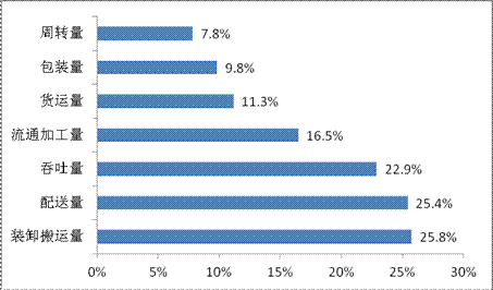 2011年物流企业主要业务量虽保持较快增长,但增幅有所放缓。物流企业货运量比上年增长11.3%,增幅同比回落8.1个百分点;货运周转量增长 7.8%,增幅回落9.7个百分点;配送量增长25.4%,增幅回落21个百分点。与此同时,装卸搬运量和流通加工量分别增长25.8%和 16.5%,增幅提高3.5和2.9个百分点。