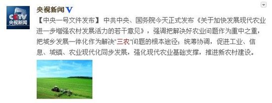 经中央电视台新闻中心官方微博消息,中央一号文件发布。