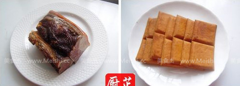 将腊肉切薄片备用;豆干用刀斜切薄片备用