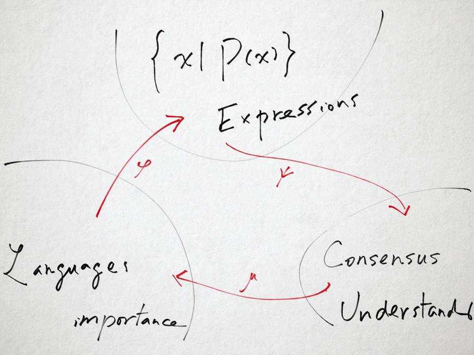 感受到的重要性,首先需要一套语言来概括。采取何种语言,实在太重要,以致有些西方思想者相信语言是“本体性的”。凡神秘主义者都不会相信语言与感受是同一的,因为大量的感受,尤其是神秘感受,无法用语言概括,也因此,这些感受被认为是神秘的。不论如何,重要性感受,若要有某种永久性,必须找到能够概括自己的语言,这就是那张图左下角的集合——全部可能的人类语言。然后,试着以某一语言表达的重要性,这是算子Phi的意思,它使感受到的重要性得以映射到全体可能表达的集合里。注意,表达与可观测性之间有密切联系。如果表达不可观测,表达究竟是否表达了?就成为一个问题。可观测,任何满足某一可观测性质P的元素x,这是那张图上方集合的意思。从表达的集合,有一个映射Psi,使被表达的能够被理解而且被至少两位主体理解,否则怎样是“共识”呢?右下角的集合是一切可能的共识的集合。从这里,有一个映射(算子)根据共识来修正关于重要性的感受。