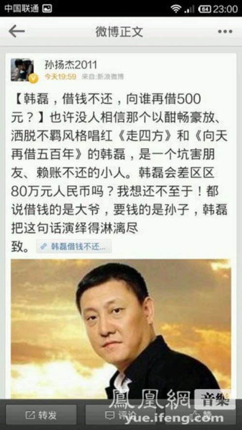 昨日,微博认证用户孙扬杰2011以《韩磊:向谁再借500元》为题,爆料歌手韩磊借钱不还。