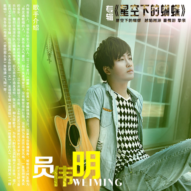 员伟明,内地音乐人,华语乐坛实力唱作人,2013年8月发行EP大碟《埋葬一个世界》受媒体强烈关注,百家电台联播推荐,被粉丝及网友称为“用灵魂歌唱的人”,2013年11月发行专辑《星空下的蝴蝶》,其作品大气豪迈,却不失柔情爱恋,没有被世俗所引导,没有因为商业而改变风格,一直坚持做真实的音乐,是目前华语乐坛少有的优秀音乐人之一。03年开始研习吉他,04年赴武汉就读武汉市艺术学校,07年赴北京研习音乐创作,曾担任摇滚乐队主唱兼吉他手,后又亲手打造吴语恒,张允哲,柳为等歌手,为他人制作及监制唱片50余张,推广发行40余张华语专辑,包括蓝燕《失去你的那一天》,吴语恒专辑《吴语恒》,傅羽《给最深爱的人》,张冬玲阿宝《一路歌唱》,张冬玲《母亲》《爱你那么多》朱铭捷《飞翔》等。