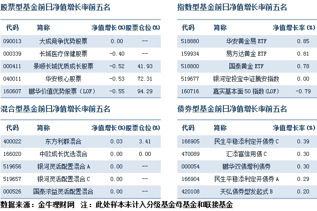 固收类基金:资金利率全线走高,债基收益整体平均下跌0.12%。昨日资金面表现趋紧,资金利率全线走高,SHIBOR 1W上行52.2BP至4.025%。结合农发行招标结果,债券市场利率产品及信用产品收益率整体小幅波动为主,城投债交投热情不高,收益率涨跌互现。债基收益整体平均下跌0.12%。具体看来,二级债基整体平均净值下跌0.28%,鹏华双债增利债券上涨0.3%居首。民生加银转债优选债券A、C下跌1.78%,跌幅最大。一级债基平均净值下跌0.07%。汇添富信用债C涨幅为0.3%居首;华宝兴业可转债债券下跌1.43%。纯债基金净值平均上涨0.01%,鹏华丰利分级债券上涨0.45%居首。债券指数基金整体净值下跌0.06%,华夏亚债中国指数C上涨0.1%居首。