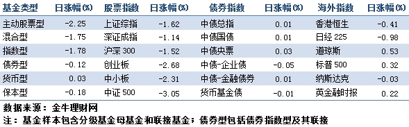 权益类基金:大小盘疯狂杀跌,主动股混型下跌2.05%。昨日在市场对经济增速下行以及流动性的担忧背景下,新股重启引燃市场悲观情绪,杀跌情绪释放。截至收盘,上证综指报2003.49点,跌幅为1.62%;深证成指报7240.46点,跌幅为1.14%;中小板和创业板则跌幅较大,其中中小板指报4478.17点,下跌2.31%;创业板则在上周五破位1300点后继续下跌,全天跌幅为2.68%。11个天相一级行业全线下跌,金融、地产、交运跌幅较小,信息技术、医药等行业跌幅居前。受此影响,权益类基金整体平均净值下跌1.97%。指数型基金下跌0.36%。主动股混型基金下跌2.05%,仅一只基金业绩收正。风格上,中小盘成长型基金跌幅居前。主题上,新兴产业、医药主题基金跌幅较大。主动股票型基金中景顺长城优质成长股票和华安核心股票跌幅较小。混合型基金中仅东方利群混合净值微涨。