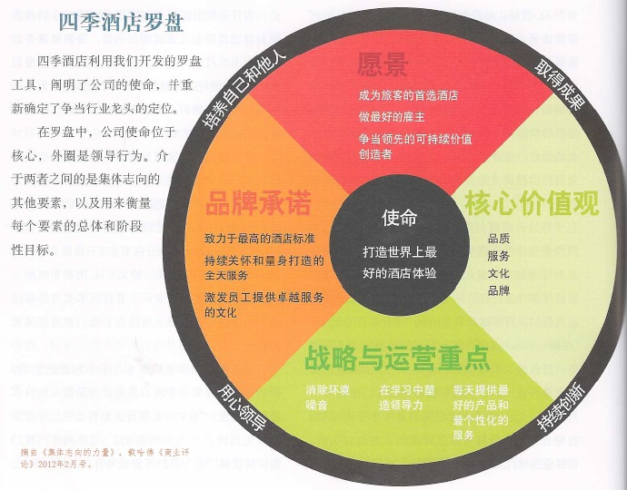 这些要素清晰明确,可以帮助领导者发现哪些方面存在问题,然后采取措施加以解决。例如,他们可能发现,尽管社区影响力这个概念让领导者深受鼓舞,但他们的奖金是与营收增长挂钩的。这种相互错位很难激励领导者在行动上符合组织的使命和愿景。我们用一系列同心圆来阐释集体志向。它就像是一个罗盘。使命位于中心。外圈是推动取得进展的领导行为。介于两者之间的是愿景、品牌承诺、战略与运营重点、核心价值观,以及用来衡量在每个要素上所取得进展的总体目标和阶段性目标。附图“四季酒店罗盘”中可以看到,这家连锁酒店明确了自己的目标——成为旅客的首选酒店;做最好的雇主;争当酒店行业领先的可持续价值创造者——从而使原本模糊不清的愿景变得清晰起来。