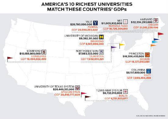 新共和(New Republic)网站最近公布了一个十大富可敌国美国大学排行榜,就采用了依照大学基金会资产的方式,并且配比根据世界银行公布的各国GDP数据。