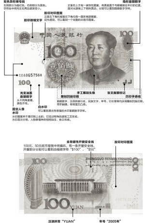 除了沿用传统的水印、安全线、凹版雕刻等防伪技术外,2005年版人民币还使用了目前国际主流的光学防伪手段,采用更多新的大众防伪技术,同时借鉴国外钞票设计的理念,将防伪技术充分地应用在钞票的机读功能中。