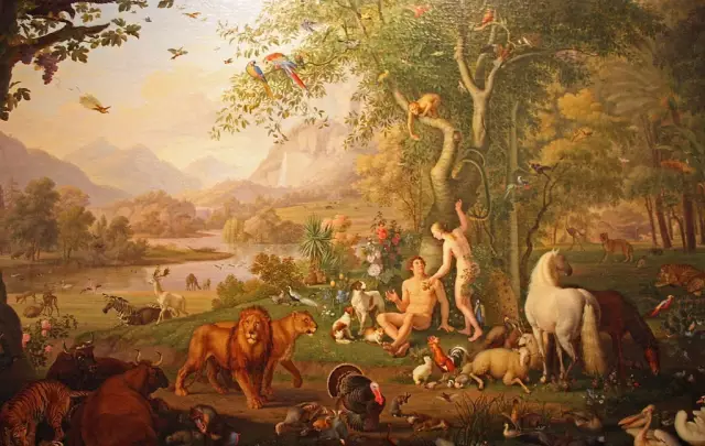 ▵ 伊甸园(希伯来语:גן עדן),根据《圣经·创世记》记载,耶和华上帝照自己的形像造了人类的袓先,男的称亚当,女的称夏娃,安置第一对男女住在伊甸园中。伊甸园在圣经的原文中含有快乐,愉快的园子的意思(或称乐园)。