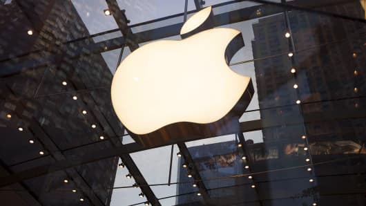 The Apple logo is displayed at the Upper West Side Apple store in New York.