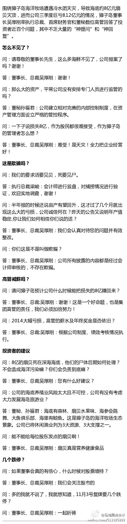 答:“您的投资经历就是中国股市的活教材,应了春晚一个相声节目中的那句话:姚明走进去,潘长江出来……再一个高送转,或许两个潘长江加起来会等于一个姚明。我理解。”