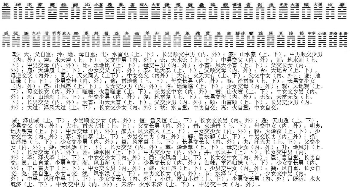(4)上经诸卦的确定原则包括:乾坤自重卦及互重卦(共四卦,为乾、坤、泰、否);父交6子女之卦(除阴爻为初、上的夬、姤卦和阴爻为初、二爻的遯卦以及阴爻为五、上的大壮卦外,共有八卦,为需、讼、履、小蓄、同人、大有、无妄、大畜,其中四卦与前述一阳五阴卦中的四卦相同);母交3子之卦(共六卦,为复、剥、师、比、谦、豫);母交长、少女而成二阳统四阴之象的观、临二卦;长中少男内外顺位相交的屯、蒙二卦;长男少女、长女少男内外顺位相交的随、蛊二卦;长男中女少男内外顺位相交的噬嗑、贲二卦;长少男互交的颐、大过二卦;中男、中女自交的坎、离二卦。共计18卦对、30卦。