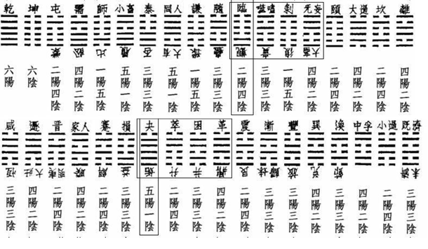 (困井)萃升为二阳四阴卦对,其后当为三阳三阴卦对(仍有7卦宫待排、其中4个三阳三阴卦对),即从困井、渐归妹、丰旅、涣节中选一个卦对。因排卦者存有强烈的忧患意识,故以困井继萃升以警初升者。