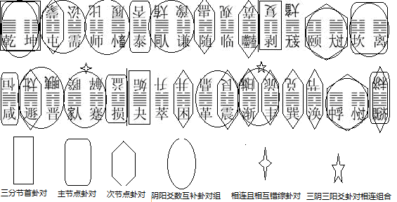 (2)依据先天八卦“天地定位”原则,确定“乾坤”及其左右卦“夬姤”、“剥复”为主节点卦对将三十六个卦对三分(这一原则可能最早产生于《归藏易》),各三分节的首卦对依次为“乾坤”、“剥复”、“夬姤”(如《归藏易》已有此原则,其首卦对就应为“坤乾”);
