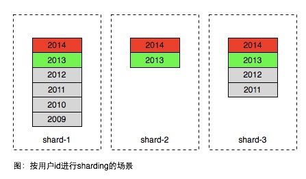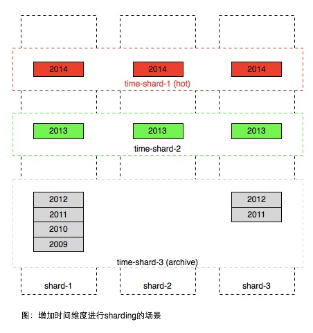 注意在上图中使用时间方式sharding之后,在一个时间分区内,也需要用前一种方案将数据进行sharding,因为一个时间片区通常也无法用一台服务器容纳。