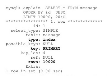 我们可以使用MySQL explain来分析,从下文可以看到,当offset=10000时候,实际上MySQL也扫描了10000行记录。