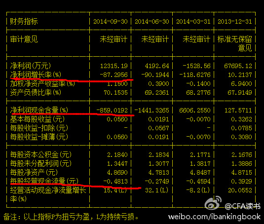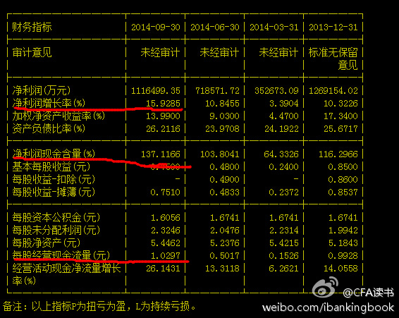 4. 看看财务指标。前面说了一堆,还是要看看财务指标。毕竟股票是投资理财的手段之一,放银行利息少,就买点股票。可收益和风险是成正比的,收益大,风险肯定大。当然,很多时候,风险大,你的收益确不一定大。当然,你也不需要去考一个什么CFA或者去学财务分析(当然,有家金多多教育的培训机构还是很好的),只要掌握几个简单的概念就可以。第一个就是PE,就是股价和每股盈利的比值,打个比方PE是10,就是股价是10元,每股盈利是1元,也就是大概10年的时间,就可以把本钱赚回来。你把这个PE倒过来,就是你的资金的盈利能力,10倍的PE,那么资金的收益率就是10%,你用这个去和银行的存款利率比较。万一股票跌了呢?股票跌了,那你的资金收益率上涨了啊!!!那些PE30倍以上的股票,还是不要看了。当然,比PE再多一点点,还需要大家受累看一下现金流是否充沛,因为利润是可以做账做出来的,万一向獐子岛那样,海里的小伙伴们都消失了,一下子产生8亿的亏损,小心脏肯定受不了。所以很多股票行情软件里都有财务分析。所以受累看一下下面的,一个是净利润增长率,净利润现金含量,还有每股经营现金流量这几个指标。如果连续增长率不错,而且连续净利润现金含量高,PE也不高,那就真的是极好的股票标的了。当然,有比较才有鉴别,列了一个好的,也同时列了一个差的。这些指标不用多少知识也能看明白。