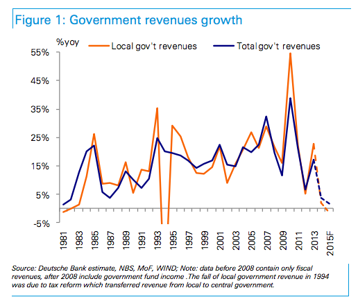 现实是2014年3月房地产市场已经大幅降温,直到2014年第三季度,卖地获得的财政收入都成正增长趋势。房地产市场的降温直到2014年第四季度才显现在财政收入上。而进入2015年后,房产市场低迷的效应将全面反应在财政收入上。