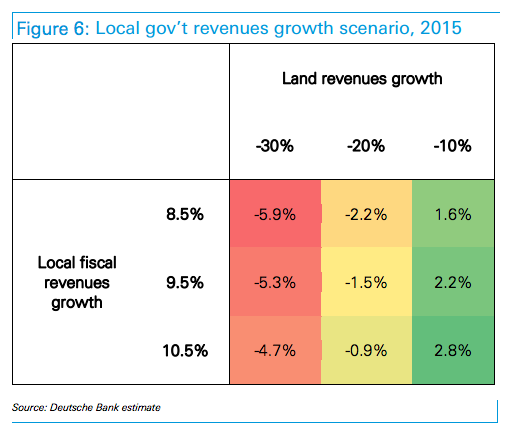 德意志预测2015年土地收入将继续下降。之前数据显示土地收入占地方财政收入的35%,占全国财政收入的23%。在全国范围内,2014年第一季度到第三季度,地方ZF的卖地收入增幅达16.6%。但纵向来看,第一季度土地收入相比去年同期增长40%,而第三季度土地收入和去年同期持平。