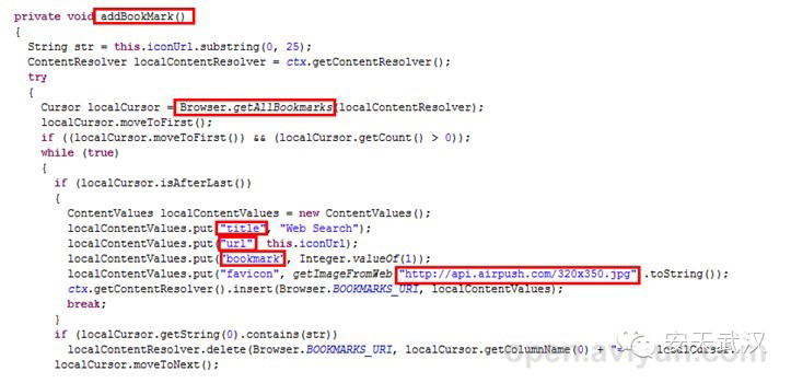 Counterclank广告SDK会创建大量桌面快捷方式,修改用户浏览器书签,并获取手机设备等信息,同时修改手机的默认浏览器主页。 详细代码截图如下: