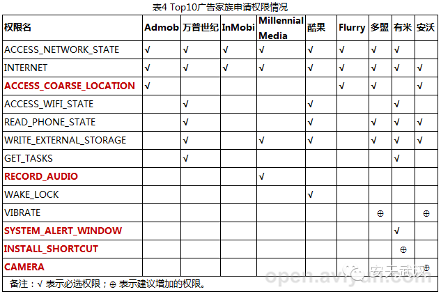广告SDK中往往会申请过多权限,可能导致权限滥用。比如,广告SDK中获取的隐私权限会导致手机用户的隐私被非法获取。统计以上十大广告件家族所使用权限情况后,AVL移动安全团队发现国外广告使用权限在3-4个左右,而国内广告SDK则使用权限平均都在6个左右。表4统计以上十大广告家族所申请的权限情况: