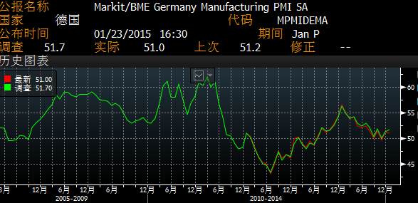 数据编纂机构MARKIT数据显示德国1月制造业PMI 51.0低于12月前值51.2,创2个月新低,同时也低于彭博经济学家调查预期51.7。