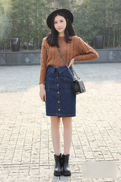 棕色系修身款套头毛衣,搭配牛仔高腰裙,勾勒一尺八小蛮腰,性感时髦