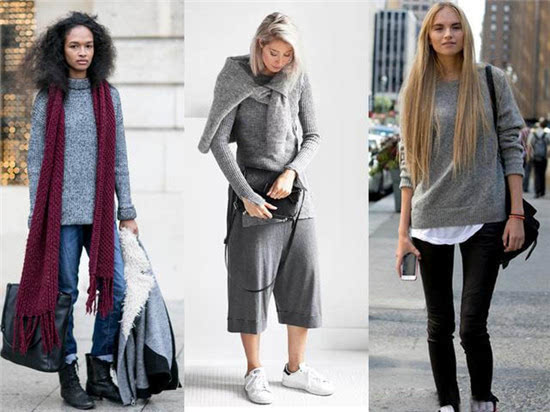 灰色针织衫上身有一种乖乖女的感觉,保守但不死板