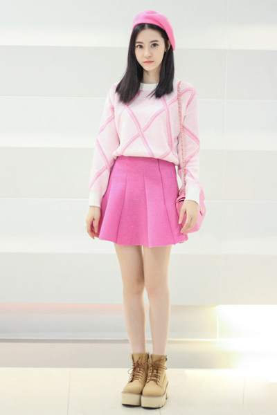 粉色菱格套头毛衣,搭配深粉色高腰裙,将毛衣扎进裙子里,勾勒小蛮腰
