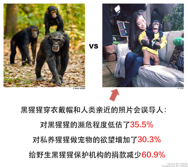 美国芝加哥的一个研究团队做过一个实验。他们找来1200多人看不同的黑猩猩照片。一些照片里猩猩是单独地站着,另外的照片里猩猩旁边则站了一个人。看完照片,这些人要评价他们觉得黑猩猩是否濒危、是否适合当宠物。结果让人扼腕:黑猩猩和人亲近的照片,使得人们对其濒危程度低估了35.5%,也使得人们希望养黑猩猩做宠物的欲望增加了30.3%。而如果把猩猩置于一个人类的环境里(比如说猩猩站在人类房间里),也会有类似的误导效果[7]。
