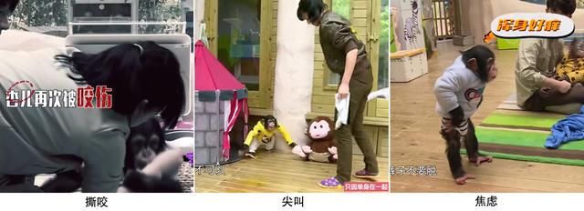 抓痒的小黑猩猩:我很焦虑,你不知道在节目当中,我们能看到小黑猩猩们的各种负面反应:Coco撕咬饲养员,咧着嘴尖叫哭闹,双足直立并自己抓痒——黑猩猩在自己身上抓挠,并不是真的痒,而是焦虑。这是学界用来判断黑猩猩是否不安的公认指标[4],但节目组对这些信号无动于衷。