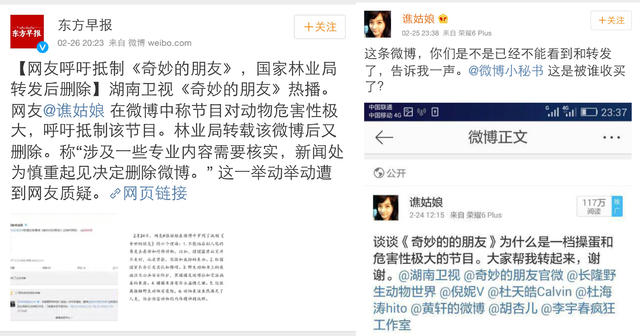 在这样的大环境下,湖南卫视的真人秀《奇妙的朋友》,显得尤为刺眼。这个真人秀以名人客串饲养员为名目,所做的事情却没有逃开动物表演的窠臼。于是,不少关心野生动物保护和动物福利的人对这个节目挑了刺。这两天,新浪微博网友@谯姑娘 发布了一条长微博,讨论了这个节目带来的危害。这条微博获得了数千的转发,还获得了国家林业局的转载。