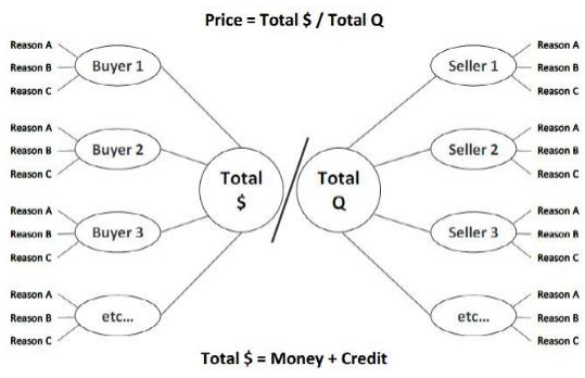 对于一个市场(或者对于经济),如果你知道了支出货币以及信贷的总额、所卖商品的数量,你就是知道了理解经济的所有的事情。比方说,既然任何商品、服务以及金融资产的价格等于所有买方花费的支出(total $)除以卖出的总产量(Q),因此如果要了解或者预测商品的价格,你只需要预测出总支出($)以及总产量(Q)。然而,每一个市场有都大量的买方和卖方,并且这些买方和卖方交易的动机不一致,但是最主要的买卖动机总是很好理解,这样考虑理解经济就变得不那么困难。可以用下面的一个简单图表来说明。这种解释经济的视角比传统的解释方式要更容易理解,传统的解释视角是基于商品的供给、需求以及价格弹性。