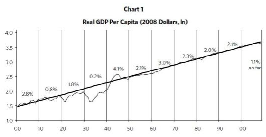 如下图所示,过去100年,每单位资本产生的真实GDP的增长平均保持在略低于2%左右,并且没有波动太大。这主要是因为,随着时间的推移,知识在增加,致使生产率的提高和生活水平的上升。在图中可以看出,从长期来看,生产率趋势线波动非常小,即使是在1930s大萧条时期。因此我们有理由相信,时间会把经济拉回到正轨上来。然而,往细里看,与趋势线的背离波动短期却比较大,比如说,在萧条时期,经济在高峰和低谷相差20%,金融财富的损失超过50%,股价下降甚至超过80%。对于萧条的起始阶段的持有金融财富的损失比图中的显示的更大,因为财富还有一个转移的过程(ZF通过税收等政策财富转移)。