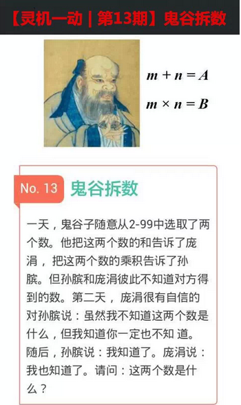 “谢丽尔生日”问题只有10个备选日期,而“鬼谷拆数”问题是从2-99中找出两个数。我看真正“任性”的应该是鬼谷子才对!