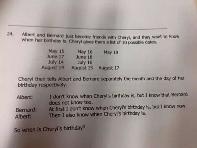 伯纳德通过阿尔伯特的第一句话推断出谢丽尔的生日只能在7月或8月。而他说原本不知道生日,现在知道了。说明,他手里的日数不可能是14,否则,他是不能确定月数的,因为7月和8月中都有14这个日数。所以,谢丽尔的生日只能在7月16日,8月15日,8月17日这三个日期中。