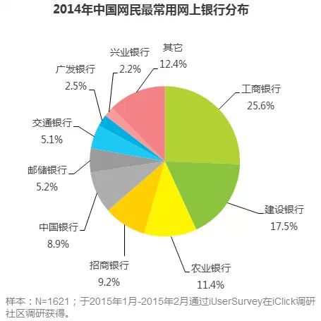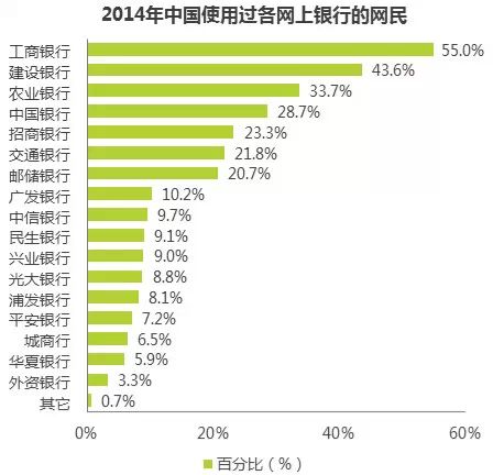 2014年中国网上银行用户选择使用过的网上银行最高的是工商银行,超过一般用户使用过。超过50%用户使用过的银行除了工行外还有建设银行,除此之外农行等五家银行使用率超过20.7%。网银用户最常用的网银分布和使用率有一定的相关性,工行(25.6%),建行(17.5%),农行(11.4%)排名前三。