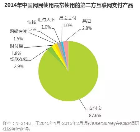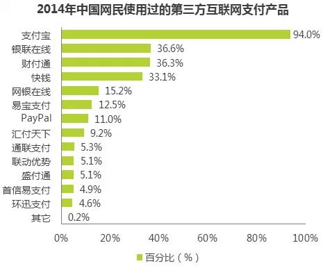 2014年中国第三方互联网支付用户选择使用的支付产品渗透率最高的是支付宝,有94%的第三方互联网支付用户选择使用支付宝,用户渗透率遥遥领先。其余渗透率较高的还有银联在线(36.6%),财付通(36.3%)和快钱(33.1%)。有87.6%的用户最常用的第三方互联网支付产品是支付宝,位列第二位的银联在线只有2.9%。