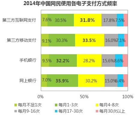 2014年中国电子支付方式中,第三方互联网支付和第三方移动支付每月支付4-8次的用户占比最高,分别是31.8%和33.5%。手机银行和网上银行每月支付1-3次的用户占比最高,占比分别是32.2%和35.9%。用户各电子支付方式月均支付金额差异并不巨大,用户在四种方式中月均支付金额的众数是101-500元,占比22.5%-25.8%,其次是501-1000元,占比20.9%-23.4%。月均支付在1000元以上的占比中,第三方互联网支付占比最大,网上银行占比最小,但四者差距不大。