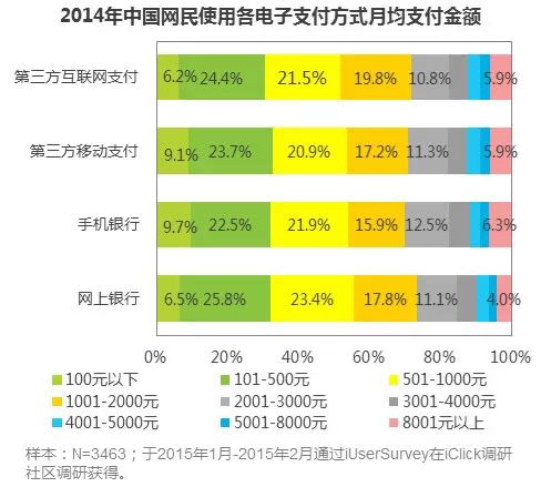 艾瑞分析认为,电子支付用户在第三方支付方式上的使用频率相对较高,用户使用第三方支付工具基本保持在每周1-2次的频率,用户每月的月均支付金额在500元上下,由此推断用户笔均消费在100元上下。
