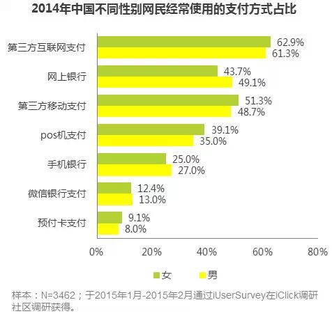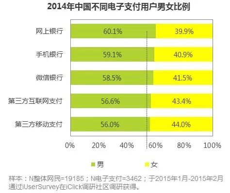 艾瑞分析认为,中国电子支付男性网民比例偏多,且男性网民更愿意使用银行电子渠道的支付工具(网银、手机银行和微信银行),中国女性网民则更爱使用第三方支付所提供的支付服务。