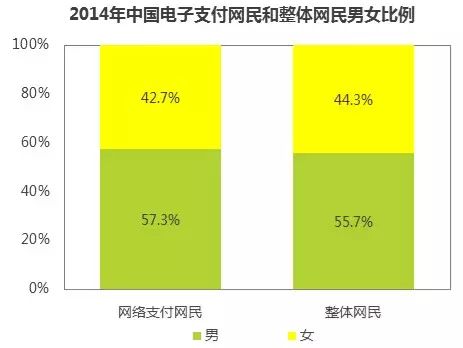 2014年中国电子支付用户男性偏多,占比达57.3%,女性占比为42.7%。电子支付中男性网民占比超过整体网民。不同电子支付方式的用户男女比例中,网上银行、手机银行和微信银行男性比例较高,占比均超过了总体电子支付的男性占比。而第三方互联网支付、第三方移动支付、pos机支付和预付卡支付的女性占比相对高。