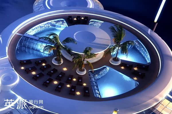 迪拜海底酒店的设计图。酒店大厅位于一个巨大的游泳池的中心。大厅墙壁上的屏幕会播放酒店外旅客潜水的画面,让你行走在酒店内却仿佛能够感受到海洋的气息。