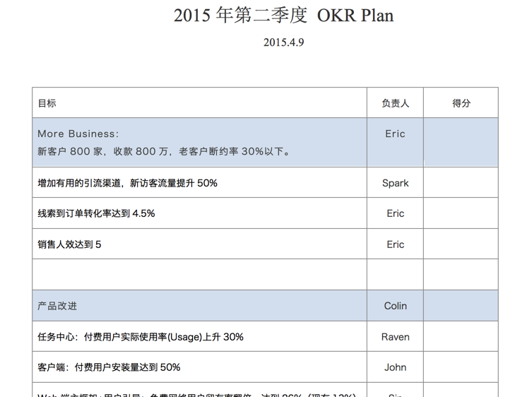 说到这里,我们手头应该就拿出了一个季度的OKR设定文件,它通常会非常精简,一般不需要超过两页纸,以下就是明道在2015年Q2设定的OKR文件局部(实际的篇幅为截图的三倍左右),为的是给读者一个更加生动的直观参考。应该简单到返璞归真了吧?