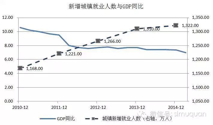 五年来,GDP增速逐年下行,但是每年新增的城镇就业人数不但没有下降,反而出现了上升。这与产业结构的变化相关,第三产业占比从2010年的44.3%,增长到2014年的48.2%。根据人社部2014年的统计数据,第三产业吸纳就业的比率比第二产业高出20%。我国人口结构变化,出现刘易斯拐点是就业指标和宏观经济增长指标发生背离的主要原因,其次,由于第三产业吸收就业的密度比制造业至少高出20%,因此,第三产业比重的上升和第二产业的相应下降从另一个方面强化了就业数据和宏观增长指标的背离。