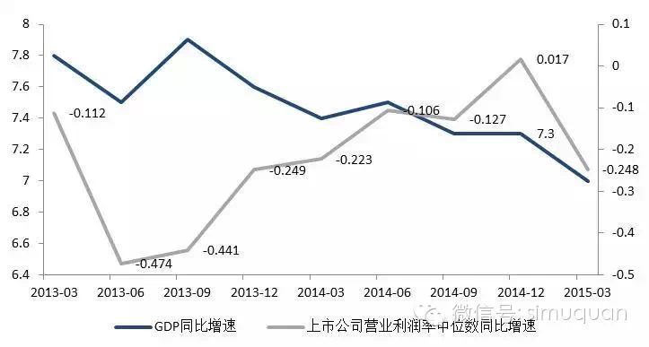 根据两千多家上市公司年报披露数据,从2013年9月份开始,到2014年底,大部分公司的营业利润率见底回升,中位数同比增速从-4.74%升至0.17%,但是同期的经济总量增长数据GDP却从7.9%一路下行至7.3%,宏观总量增长数据和企业微观利润数据之间出现明显的背离趋势,反映了在经济结构调整的大背景下,过剩行业去产能一方面带来宏观增长数据,尤其是制造业增速的大幅下滑,另一方面也带来幸存企业经营环境的改善和微观利润数据的回升。因此,在经济转型期,观察宏观周期的变化,企业利润数据往往比中观行业增长数据和GDP数据更为重要。