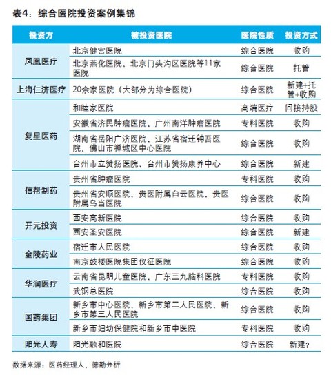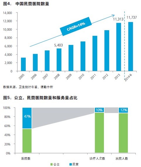民营医院相对于公立医院仍处于弱势,但在政策的强力支持下正步入飞速发展的阶段。机构投资者和产业资本纷纷涌入,借助资本的力量,民营医院将更快地实现资源整合并加速市场扩张,在管理、医疗技术、服务质量以及规模化运营各方面实现升级。然而市场的飞速扩张往往伴随着更高的风险,因而审慎的决策必不可少。我们认为民营医院战略定位上应当综合考虑地方经济发展水平、供需状况以及医改和税收政策,结合自身实力以确定恰当的医疗服务板块和进入模式。就增长点而言,我们看好四个服务板块。其一是高端医疗。高端医疗将会出现在服务地域上的下沉,同时以往热门专科在服务人群上也会出现从一般民众向富裕人群的转移。另外将医疗和旅游相结合的服务也有望成长起来。其二是专科连锁。服务性和可复制性强的细分专科细分领域有望出现投资热点。与此同时,医疗体制改革的推进尤其是医疗人才流动性加强后,民营医院有望进入技术壁垒更高的专科领域。其三,综合医院方面,资金、人才、管理各方面都意味着更高的进入壁垒,但同时也意味着建立起公众知名度的医院的地位将难以被撼动因而先动优势明显。因此,各路资本对于综合医院的布局将会提上日程。另外,对生活质量的重视以及保健意识的增强也将推动健康服务领域飞速发展,资本市场以及传统医疗机构对于远程医疗、移动医疗以及可穿戴设备的热忱就是最好的佐证。