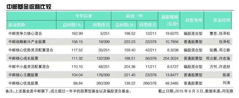 比较近一年或者更长期业绩,中邮核心优选仍然殿后。截至6月3日,中邮战略新兴产业近一年的收益率为223.23%,在全部基金中名列第25;中邮战略新兴产业以两年428.23%总回报排名同类337只产品第一名。中邮中小盘灵活配置混合以最近两年225.16%的总回报排在同类型产品第二名。中邮核心优势灵活配置混合、中邮核心主题股票也分别进入了同类型排名的前十。